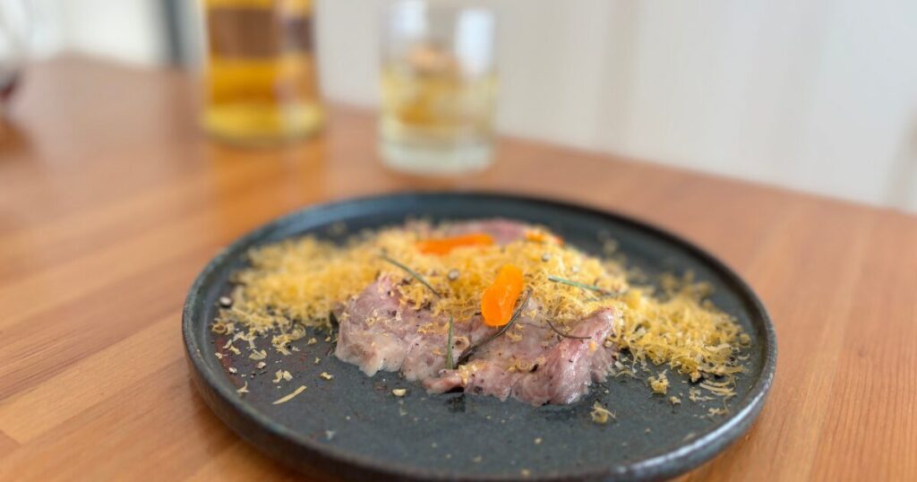 卵黄カラスミは濃縮されたコクと塩味を持ち、脂の重さを抑制しつつ味の輪郭を整える役割を果たします。