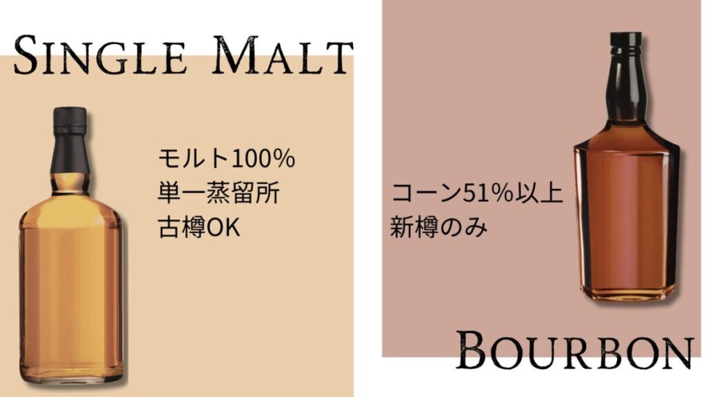 また、バーボンは「新樽」の使用が義務となっていますが、シングルモルトでは「古樽」でも可能です。そのため樽使いの幅はシングルモルトのほうが多くなるかもしれません。